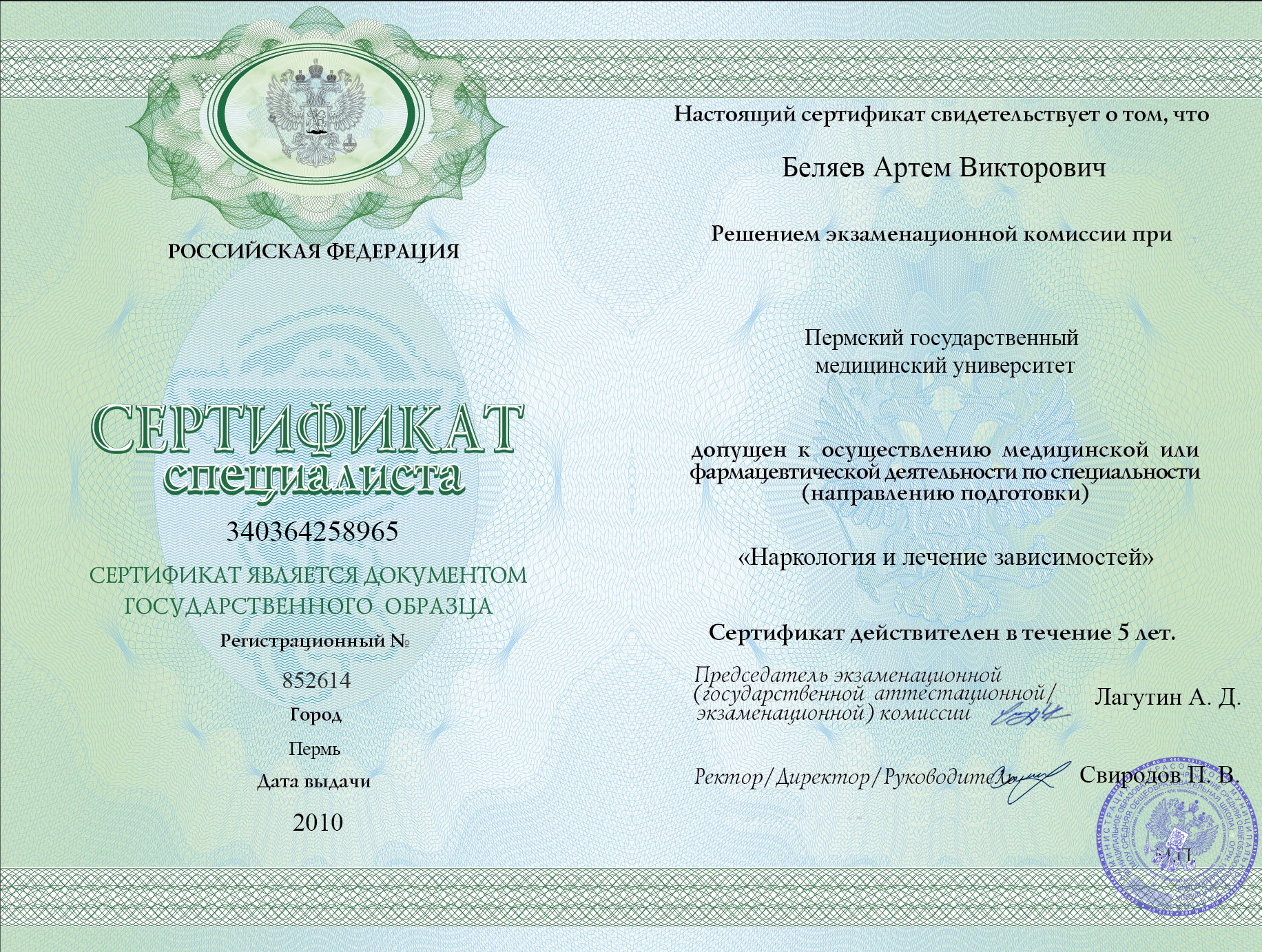 Артем Викторович Беляев — эксперт по наркологии с более чем 12-летним опытом работы в области диагностики и лечения зависимостей. Окончил Пермский государственный медицинский университет в 2008 году, получив диплом по специальности «Лечебное дело». В 2010 году прошел специализацию по наркологии и лечению зависимостей.
